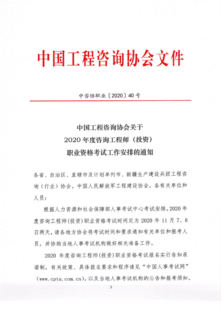 中国工程咨询协会万搏综合登录2020年度咨询工程师(投资)职业资格考试工作安排的通知